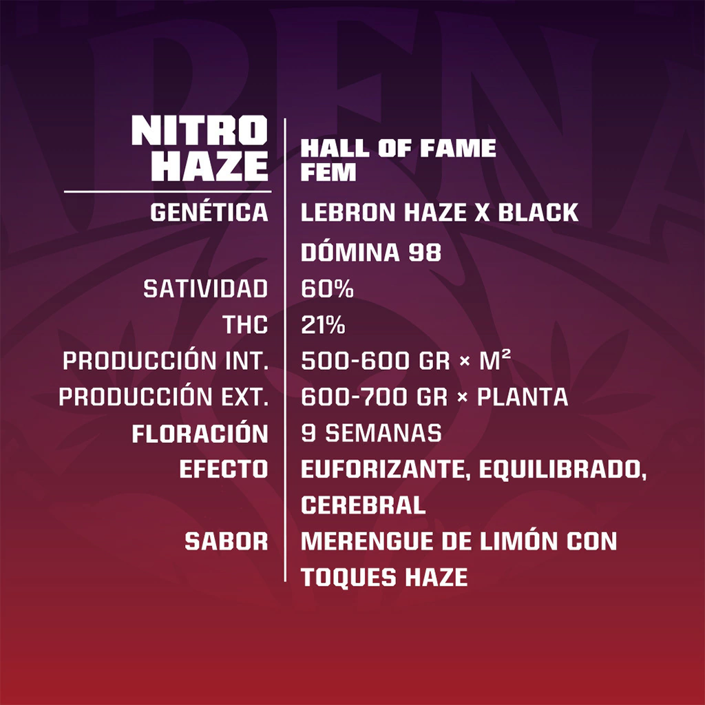 La nitro haze femnized es un cruce de nuestra famosa lebron haze de madre con nuestro clon élite de black dómina 98, desarrollando así un híbrido de predominancia sativa. El sabor de nitro haze feminized no podrá pasar desapercibido, dejando un sabroso gusto en tu paladar, similar a un merengue de limón. Además, como su nombre lo describe, es una variedad muy potente alcanzando un 21% de THC.